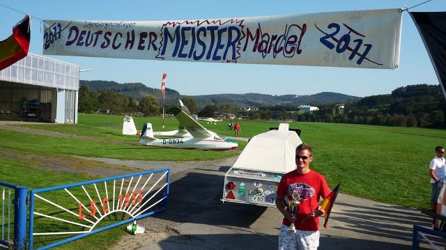 Samstags ging es schon um 08:30 Uhr los; insgesamt absolvierten die Teilnehmer 123 Starts in drei Durchgängen. Bei Marcel lief alles super, man konnte sich Hoffnungen machen! Abends startete aber zuerst eine super Fliegerfete. Am Sonntag fand dann um 10:30 Uhr die Siegerehrung statt. Der LSC Oeventrop e.V. stellt mit Marcel Brüggemanmm den neuen deutschen Meister! Nach 2002 (René Hanses) ist er der zweite deutsche Meister vom LSC!