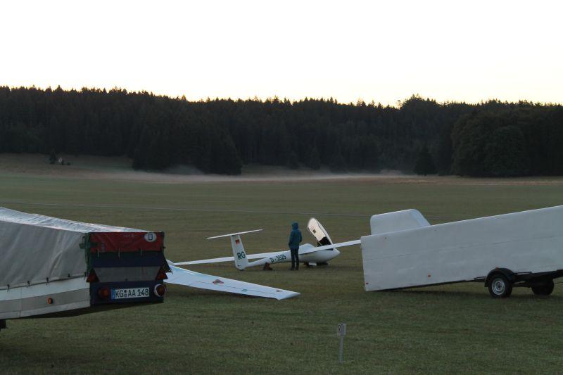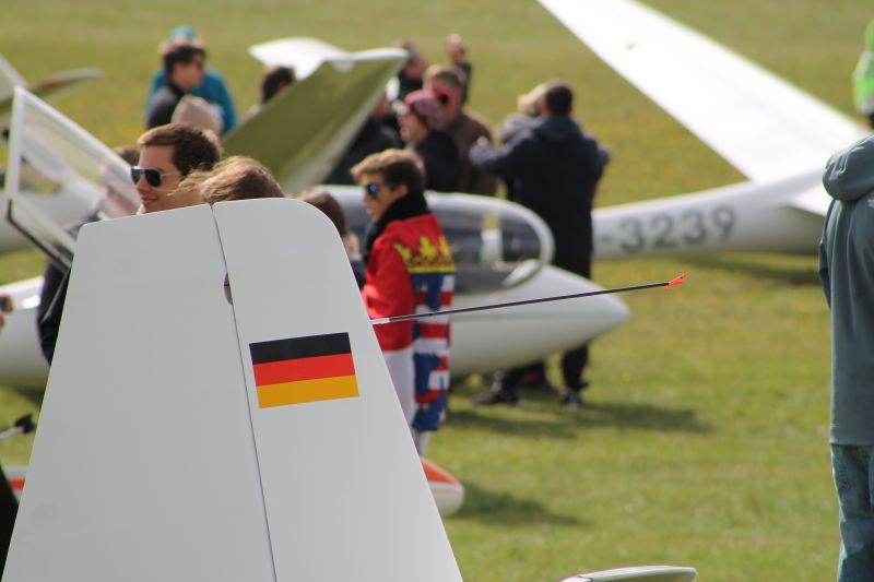 Der Start in den Wettbewerbstag erfolgte bereits um 6:30 Uhr mit dem Aufrüsten der Ka 8. Nachdem Frühstück und dem Feldbriefing konnte dann gegen 9:00 Uhr mit dem ersten Durchgang gestartet werden. Die 45 teilnehmer aus allen 16 Bundesländern absolvierten in diesem Durchgang nach dem Start einen Kreiswechsel als Übung. Zusätzlich dazu war ein Seitengleitflug (Slip) im Endanflug gefordert.