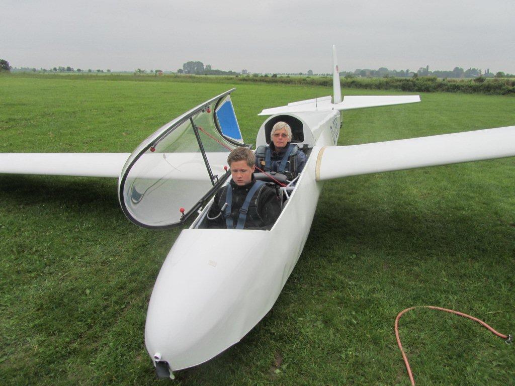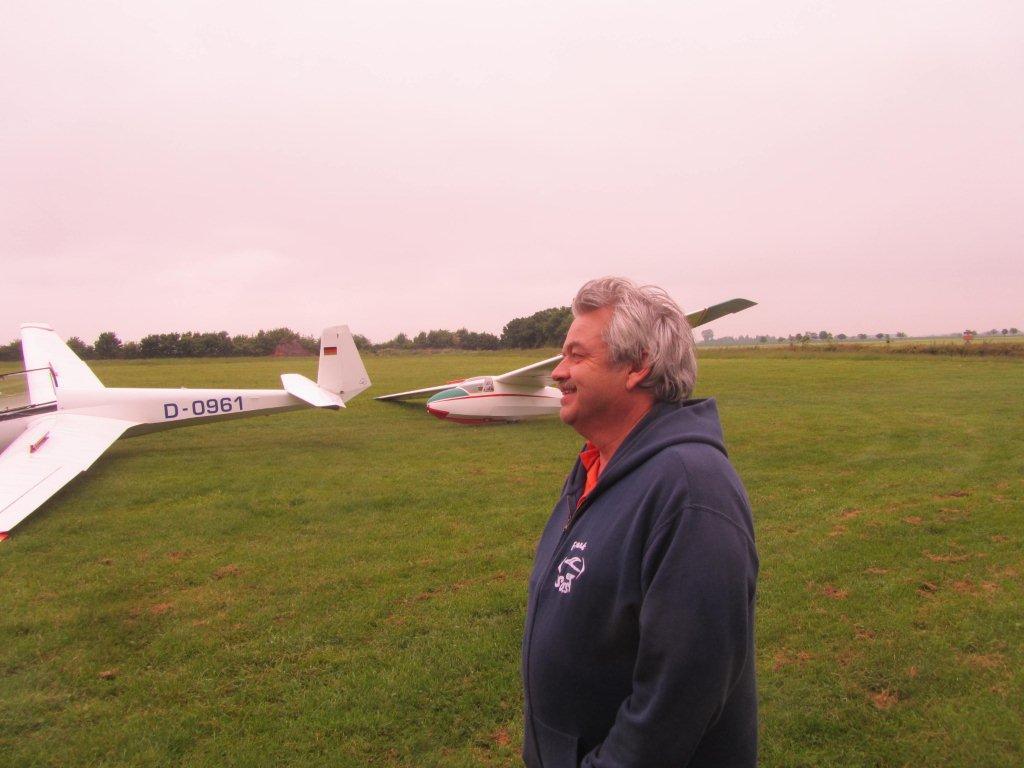 Um 15:30 konnte es dann endlich losgehen. Wegen einer immer noch sehr tiefen Wolkendecke und starkem Seitenwind fand der Erste - und wegen der schlechten Wetterlage auch einzige - Wertungsdurchgang mit einem Fluglehrer im Schulungsdoppelsitzer (ASK 13) statt.