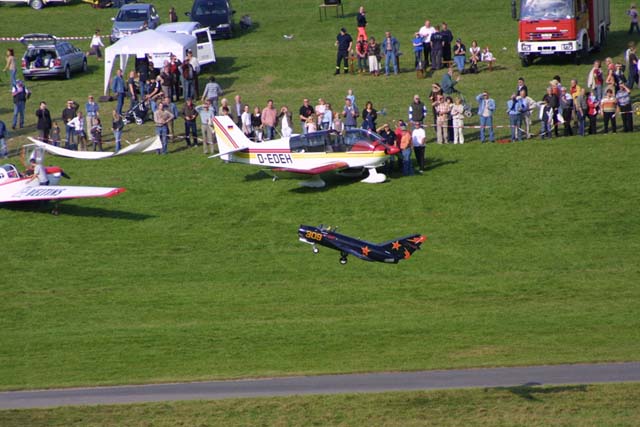 Aber nicht nur das Wetter war super, auch unser Programm hatte einige Highlights zu bieten: Man konnte einen Rundflug mit der Antonov, dem größten Doppeldecker der Welt, machen. Oder, wenn es etwas spektakulärer sein sollte, eine Motorkunstflug in einer Pitts miterleben! Aber auch beim Zusehen von unten machten die Kunstflugvorführungen der drei Doppeldecker richtig Spaß. Unten gab es noch viel mehr zu gucken: Unsere Modellfliegerfreunde boten eine super Show – das Highlight war hier natürlich die Mig im Maßstab 1:3 mit echter Turbine und einen Abfluggwicht von 33 kg!