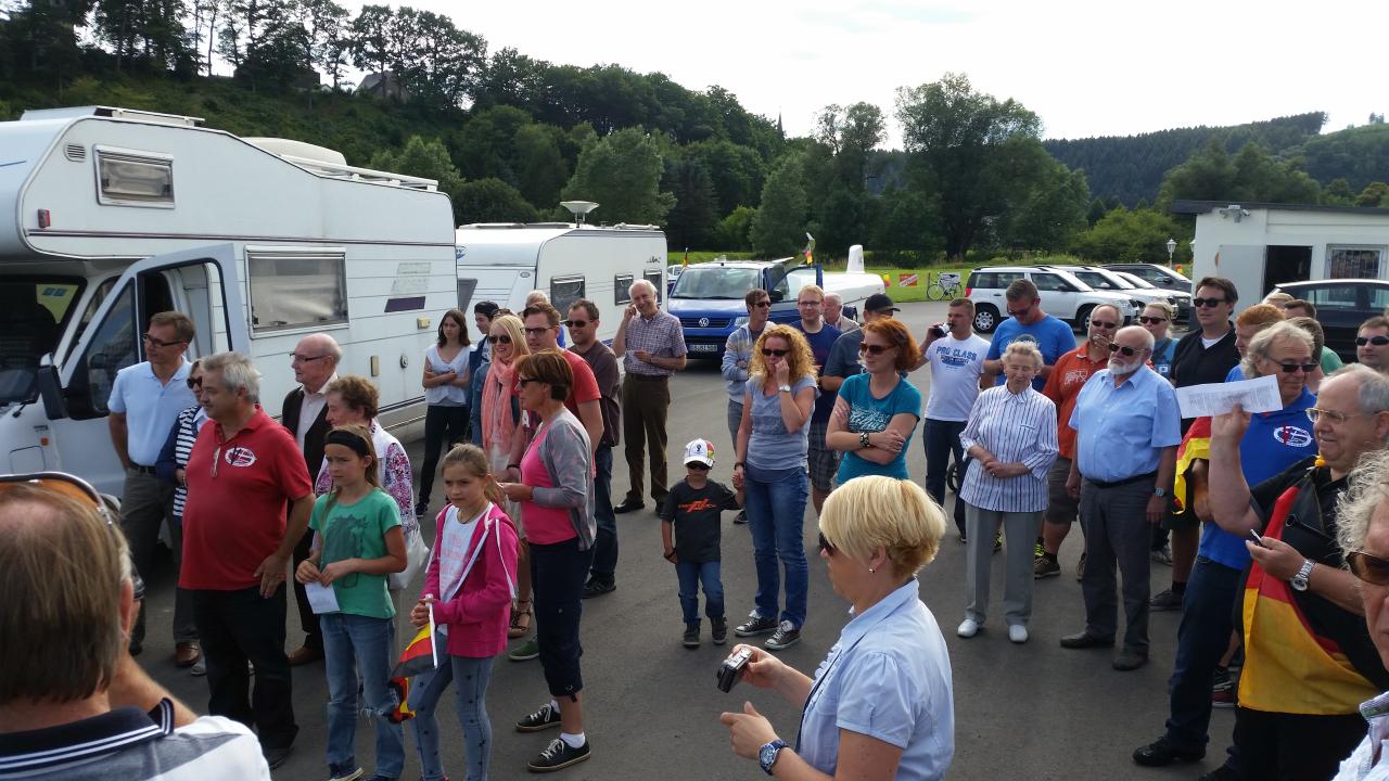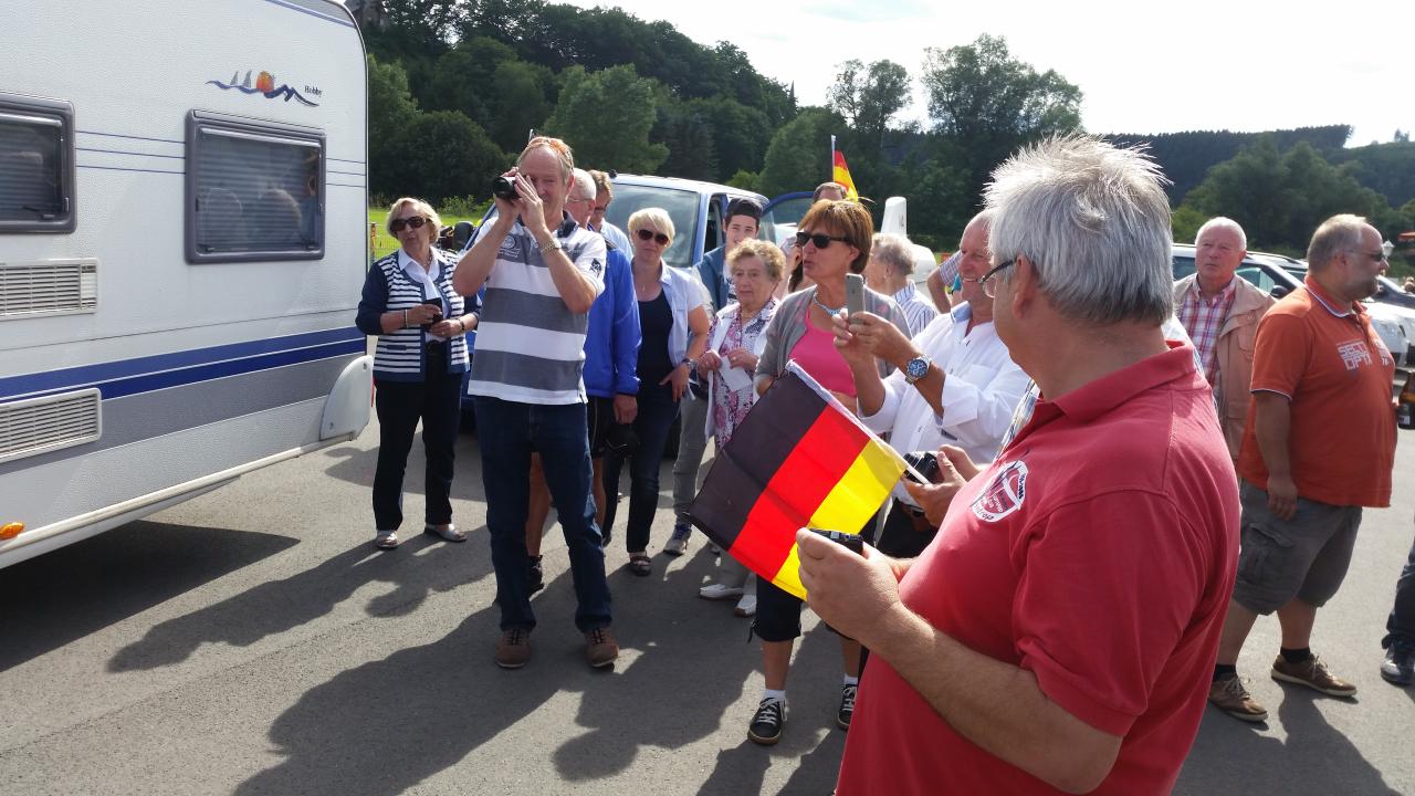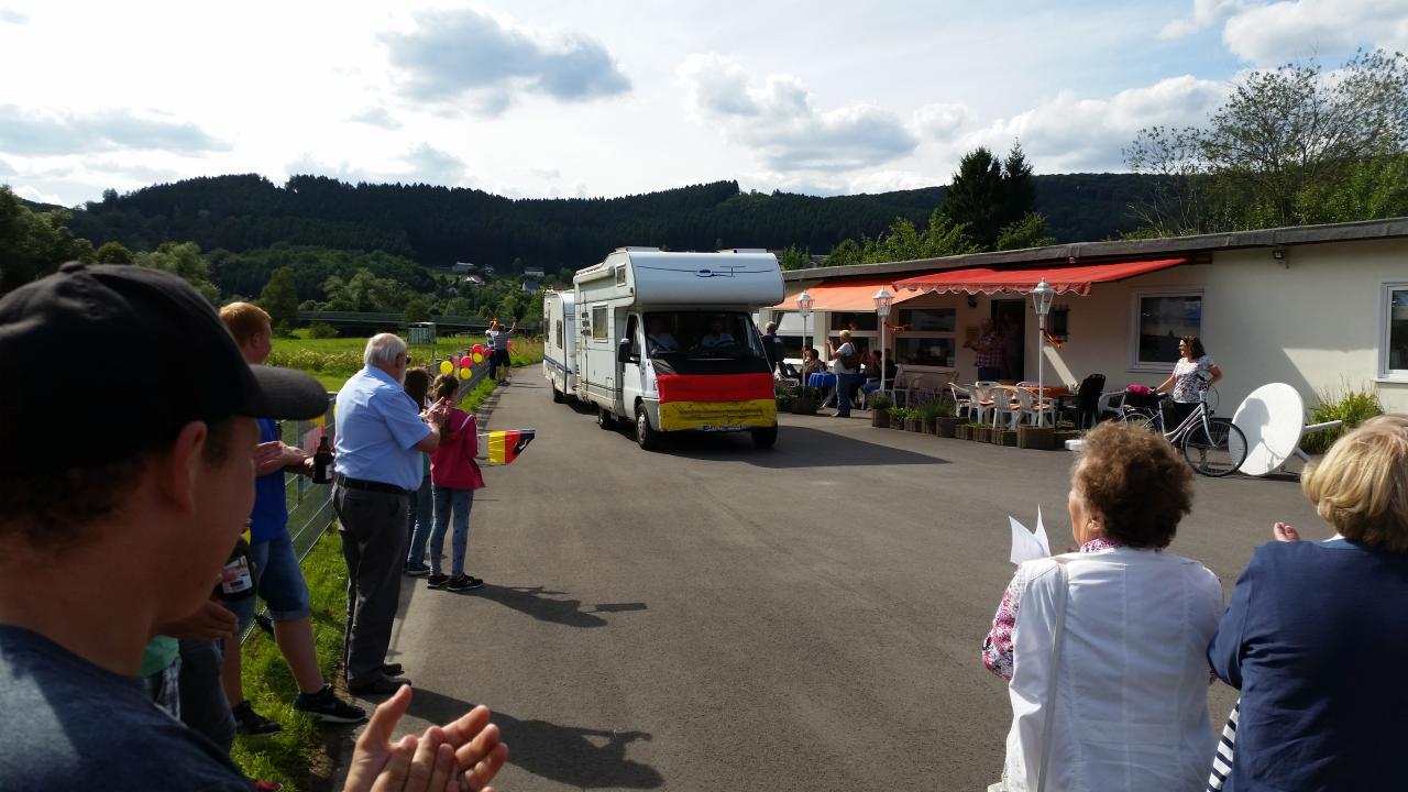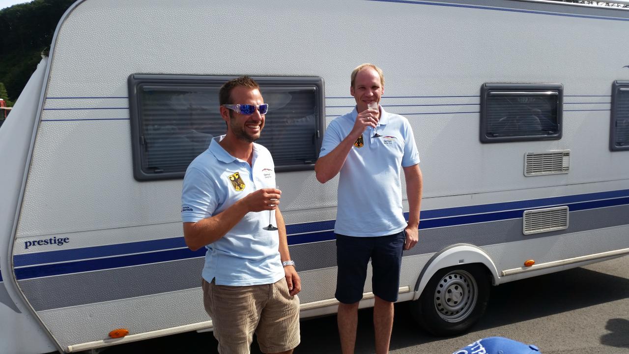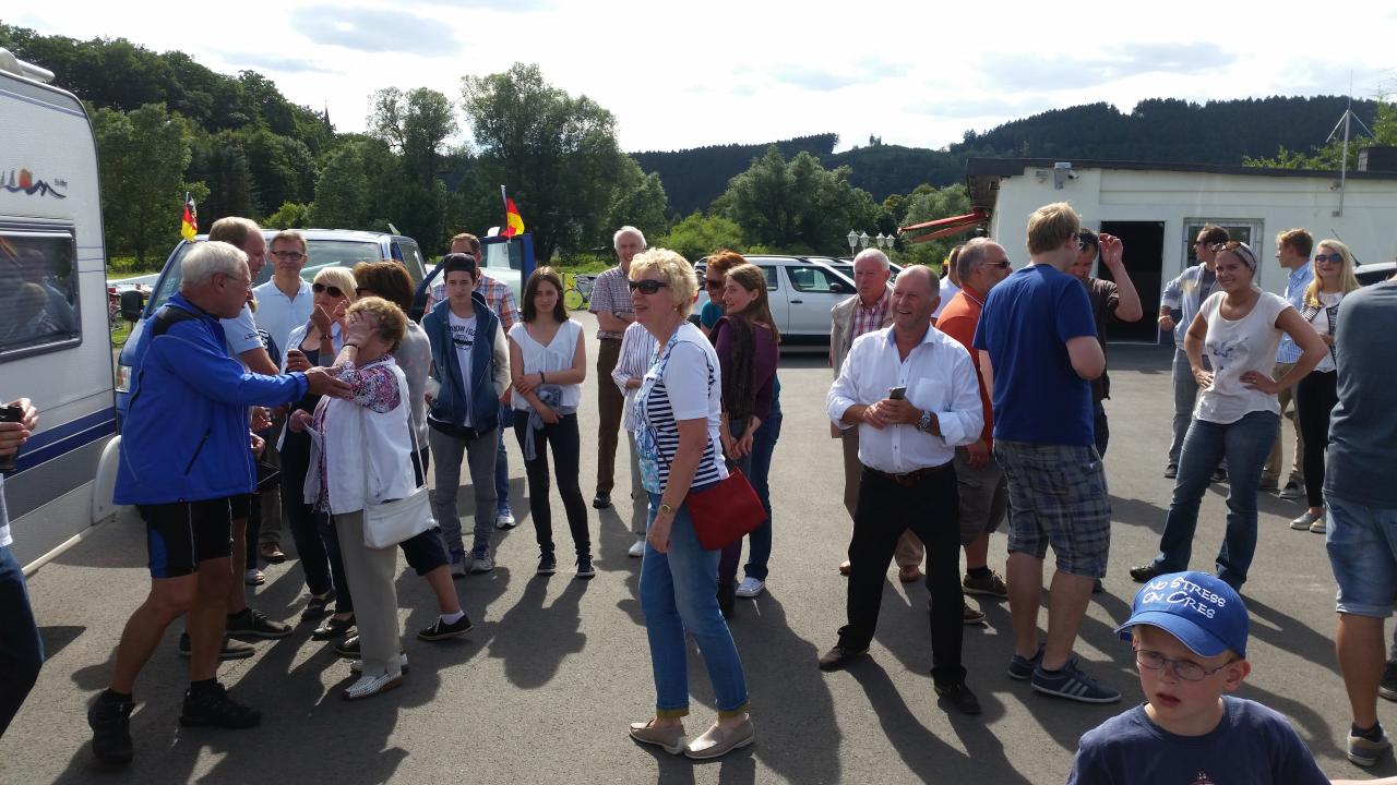 Aus diesem Grund haben sich viele Vereinsmitglieder, Freunde und Verwandte gestern (26.07.2015) am Flugplatz getroffen, um beide Piloten und die gesamte Mannschaft in Empfang zu nehmen. Gegen 16:30 Uhr fuhren die beiden Gespanne auf dem Flugplatz vor: Wohmobil + Wohnwagen mit Marco und Sebastian und Bulli + Flugzeug mit Christian Keßler und Dirk Gerstenköper. Eva-Maria Beule und Julia Hanses mit Phil stießen etwas später zu den Feierlichkeiten hinzu, sie sind mit dem Flieger gereist. Die weiteren Team-Mitglieder Monika Keßler und Johannes Lürbke konnten leider nicht bei der Ankunft in Oeventrop dabei sein.
