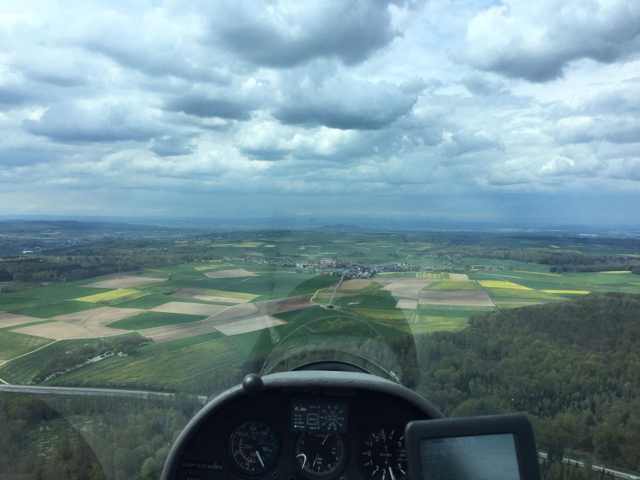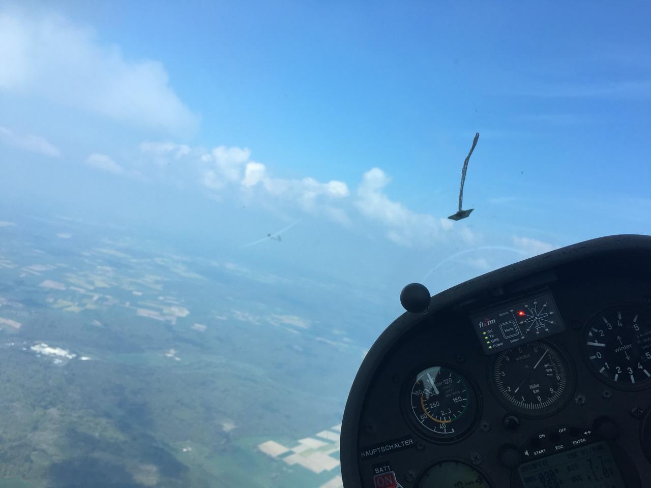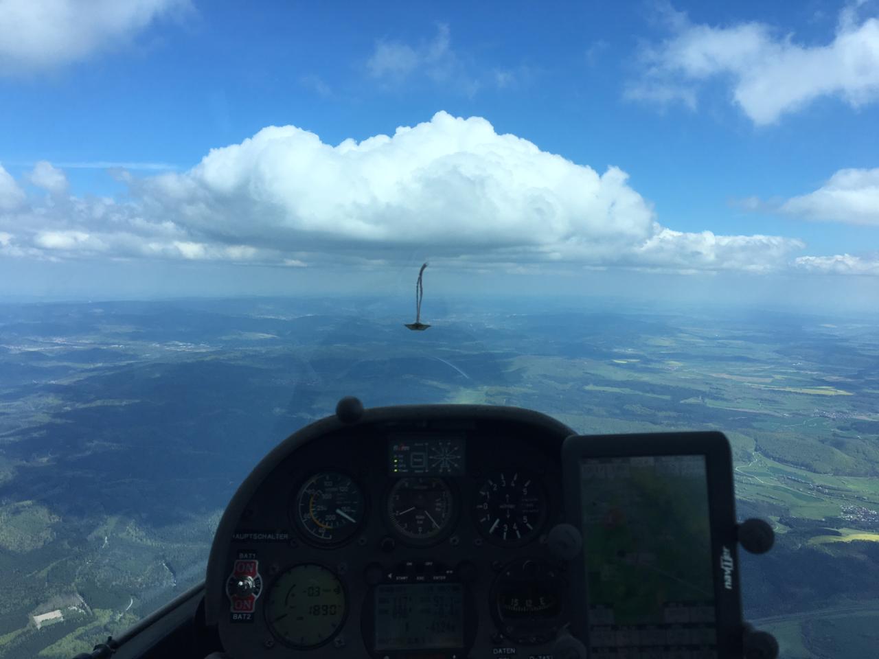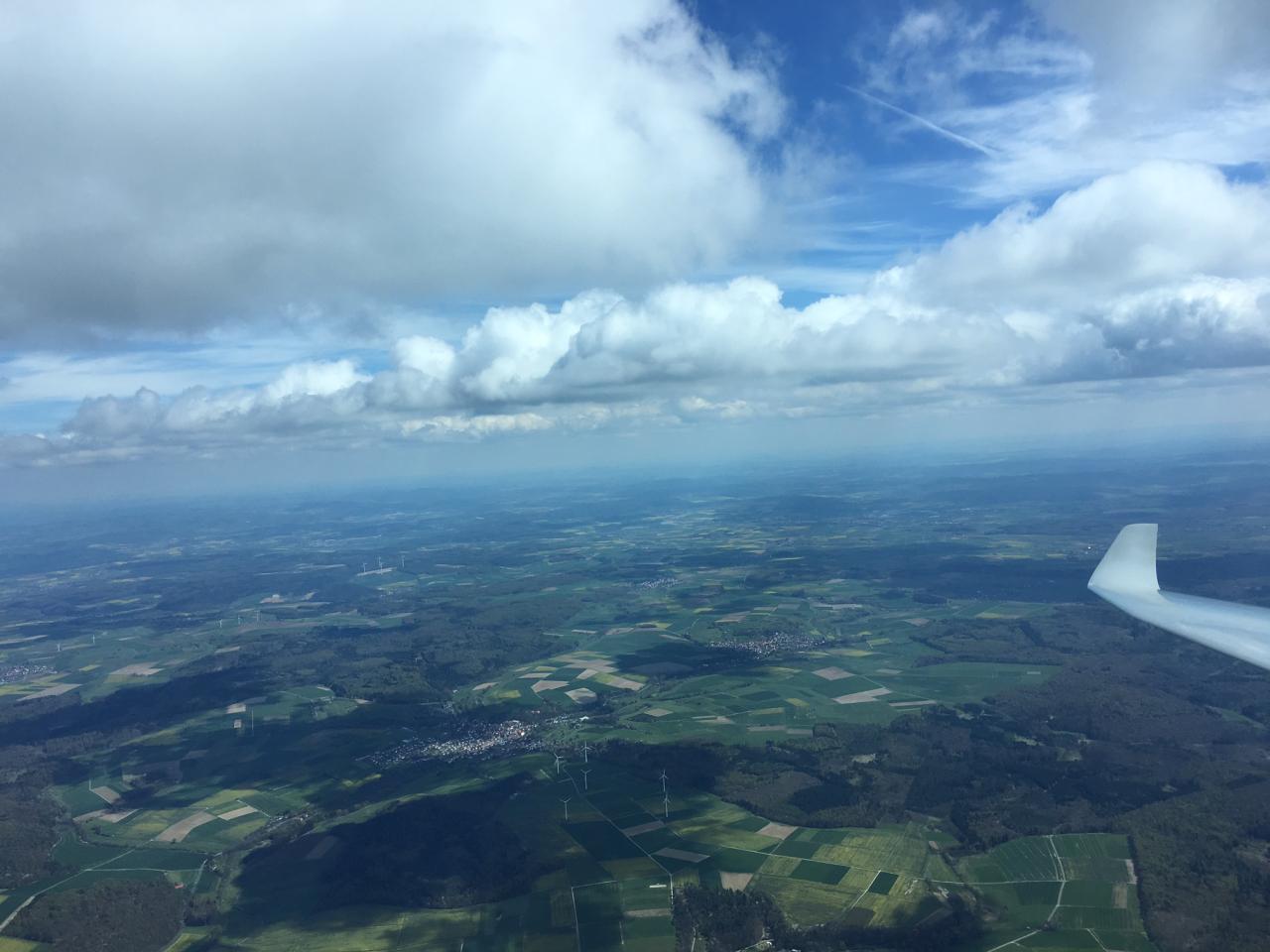 Gemeinsam mit Karsten und Enrique kämpften wir uns Richtung Spessart. Auch wenn der Weg dorthin etwas blau und unstrukturiert war, sollte die Rechnung aufgehen. Das Pulk verlor Zeit beim Umfliegen der Lufträume während wir den ersten guten Bart im Spessart ausfindig machen konnten. Die Basis ist dort inzwischen auf über 2000 m angestiegen wo wir nun bis zur Wende in einem westlichen Bogen eine sehr gute Vorfluggeschwindigkeit mit guten bis sehr guten Steigwerten etablieren konnten.