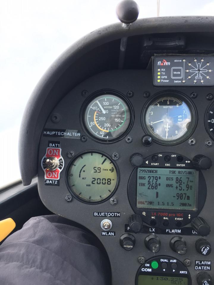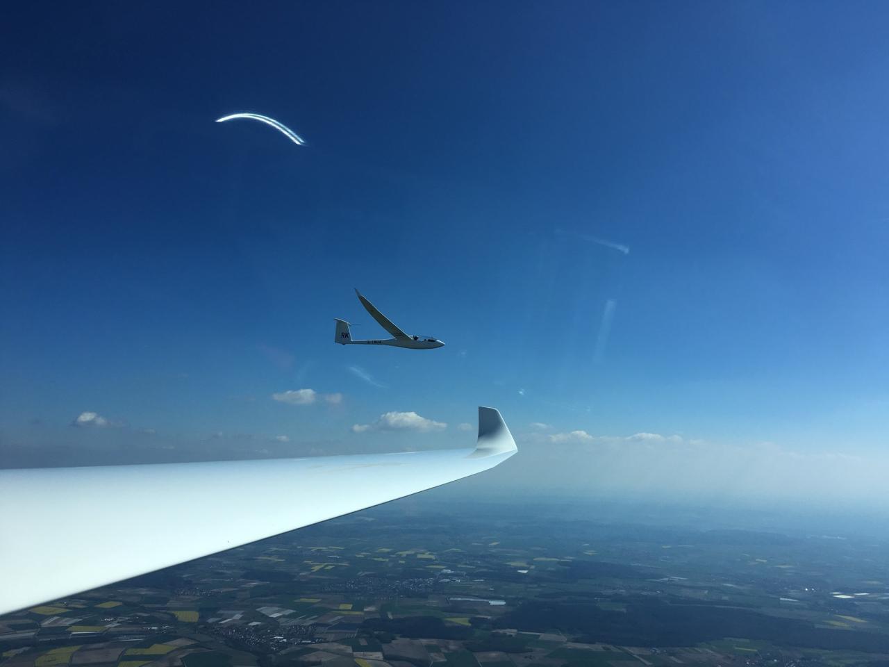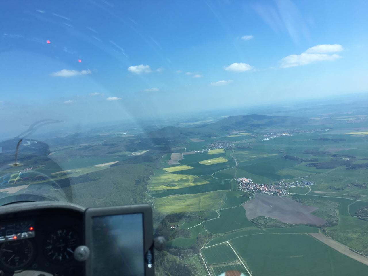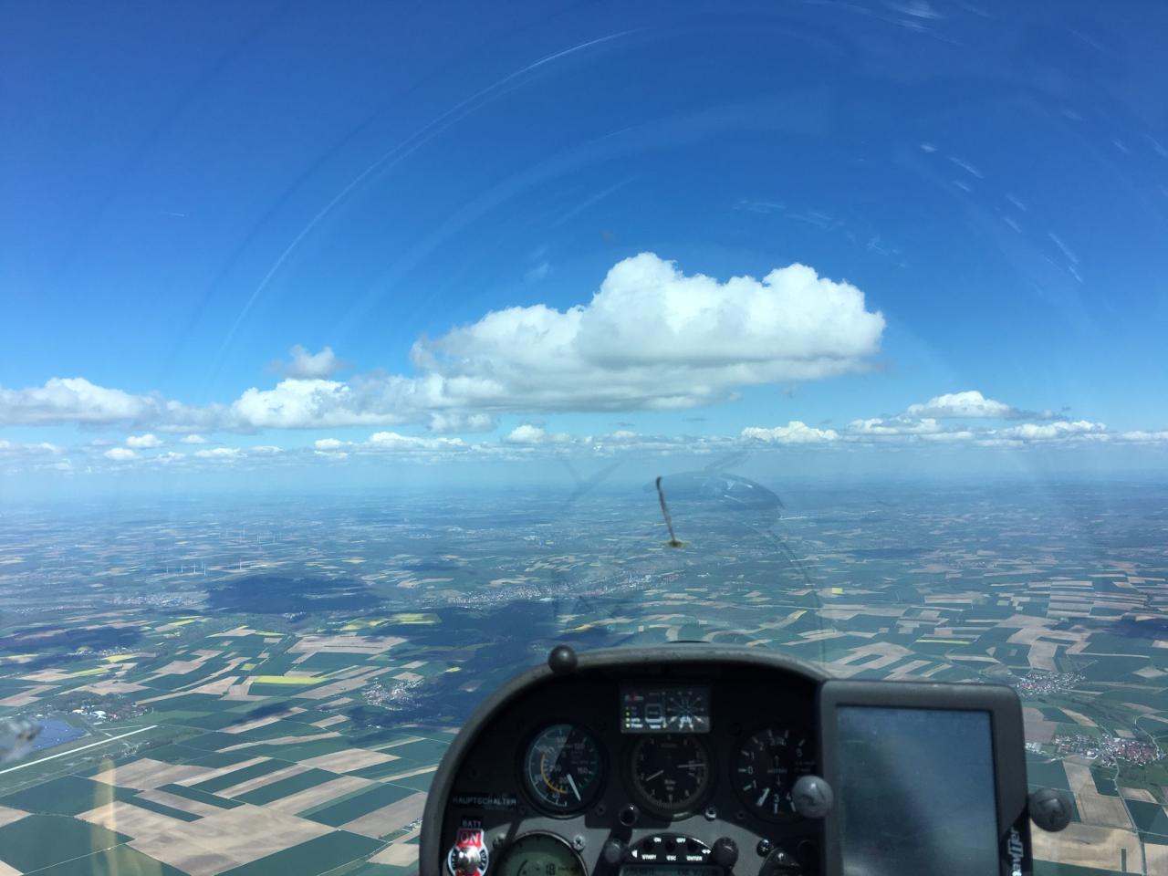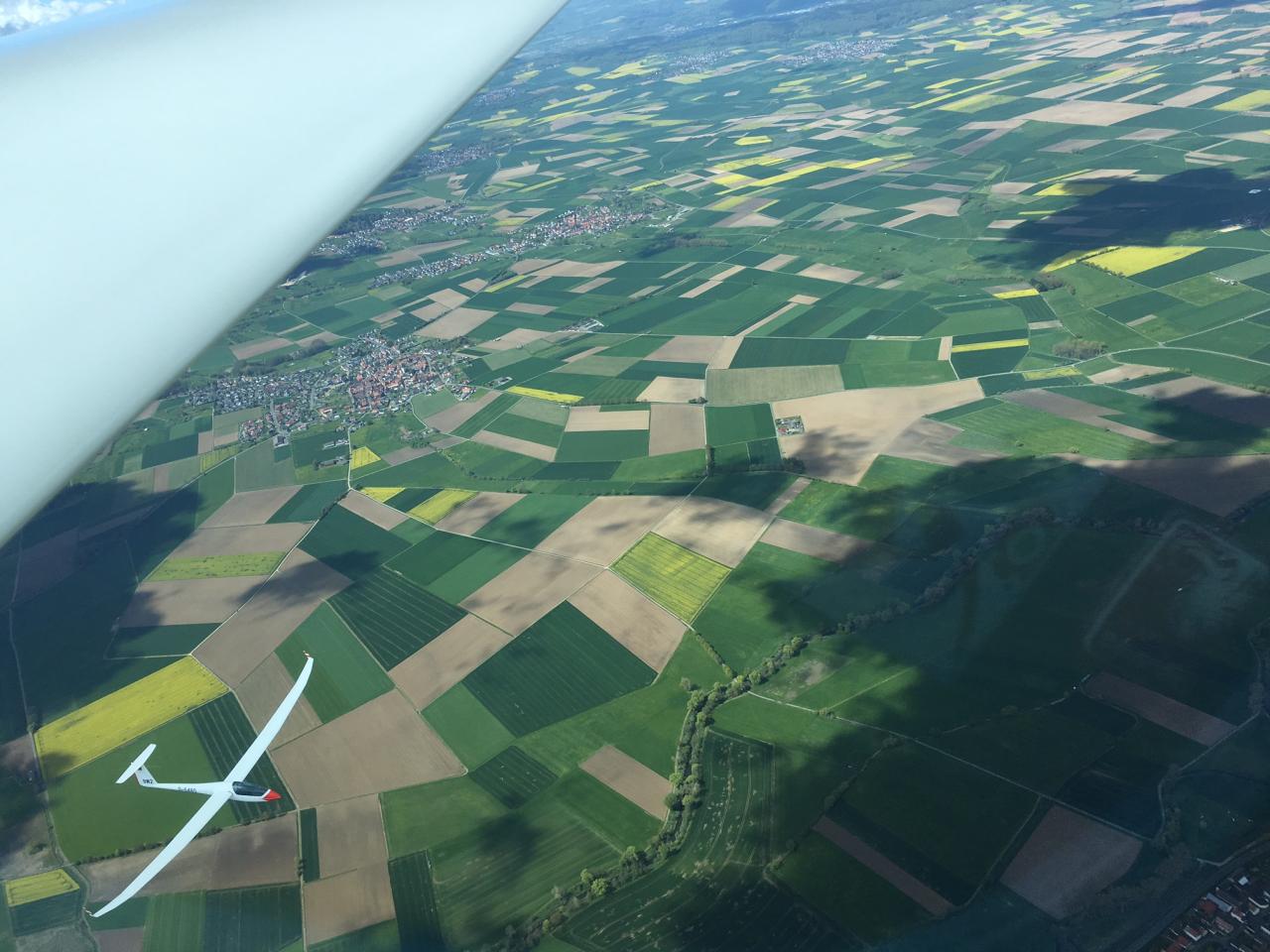 Gemeinsam mit Karsten und Enrique kämpften wir uns Richtung Spessart. Auch wenn der Weg dorthin etwas blau und unstrukturiert war, sollte die Rechnung aufgehen. Das Pulk verlor Zeit beim Umfliegen der Lufträume während wir den ersten guten Bart im Spessart ausfindig machen konnten. Die Basis ist dort inzwischen auf über 2000 m angestiegen wo wir nun bis zur Wende in einem westlichen Bogen eine sehr gute Vorfluggeschwindigkeit mit guten bis sehr guten Steigwerten etablieren konnten.