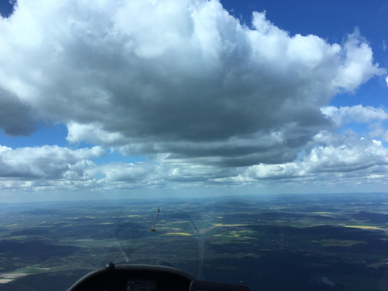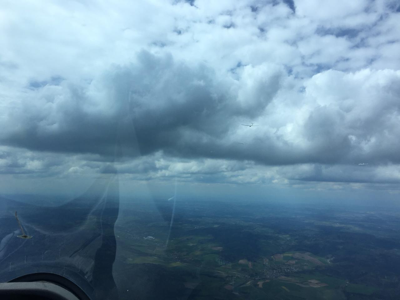 Die Aufgabe über 422 km sollte uns flächig von Homberg zunächst bis auf den Gipfel des hohen Meissners führen. Der Abflug gelang mir diesmal gut, auf Kurs war es recht blau, sodass ich mich mit einer kleinen Gruppe zunächst für eine abgelegenere Route entschied, welche von Wolken gezeichnet war. Am Abend sollte sich herausstellen, dass der andere Pulk die Blaue, direkte Route gewählt hatte, was am Ende fast aufs selbe herausgekommen ist. An der Wende war die ganze Mannschaft vereint. Vom Meissner aus ging es direkt nach Südosten bis nach Bamberg, sodass einige Entscheidungen getroffen werden mussten: sollte man auf den Thüringer Wald fliegen, oder doch besser durch die Rhön oder dazwischen? Manchmal gibt es Tage, wo der Thüringer Wald nicht wirklich durchzündet.