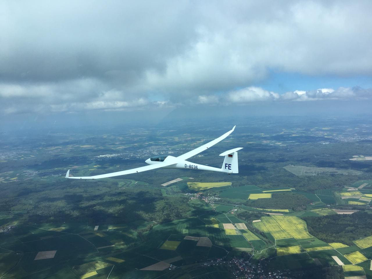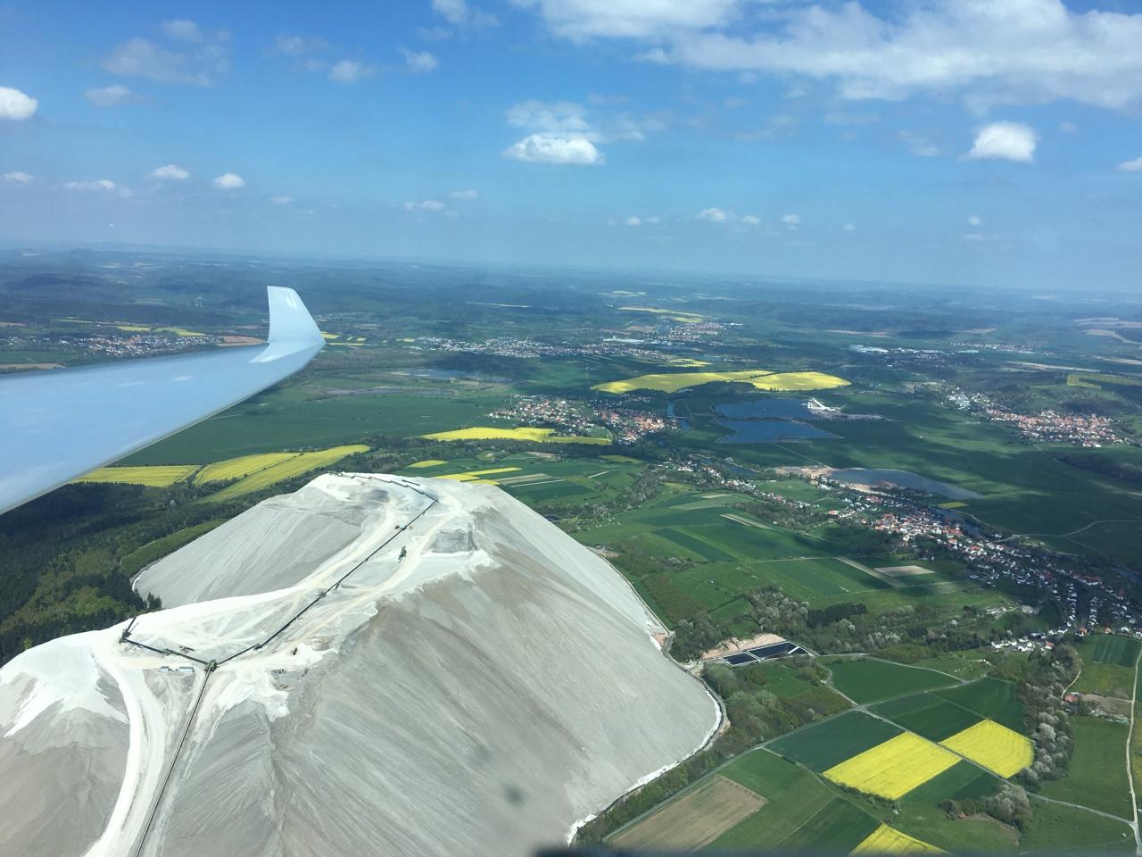 Hier trennte sich zunächst die Gruppe, Robert verloren wir irgendwann aus den Augen, er war ein gutes Stück höher und voraus. Man konnte langsam erahnen, dass der Heimweg aus dem Spessart nach Norden komplett blau war, und man mit einem rapiden Thermikeinbruch zu rechnen hatte. Ich entschied mich deshalb für eine 90 Grad Kursänderung nach Osten für einige Kilometer, um außerhalb des Luftraums von Frankfurt noch einmal bis an die Basis zu steigen, was mir auch mehr oder weniger gut gelang. Von dort an glitt ich allein aus dem Spessart ins Blaue, und es wurde sehr zäh. Irgendwann sah ich die anderen deutlich tiefer in schwachen Bärten kurbeln und glitt langsam Richtung Vogelsberg. Dort hatte ich mir die letzte Chance auf nutzbare Thermik erhofft. Sehr tief ließ ich das Wasser ab und konnte an einer Waldkante des Vogelsbergs noch einmal 1,6 m/s herausziehen, was auch dem leichten Flieger geschuldet war.
