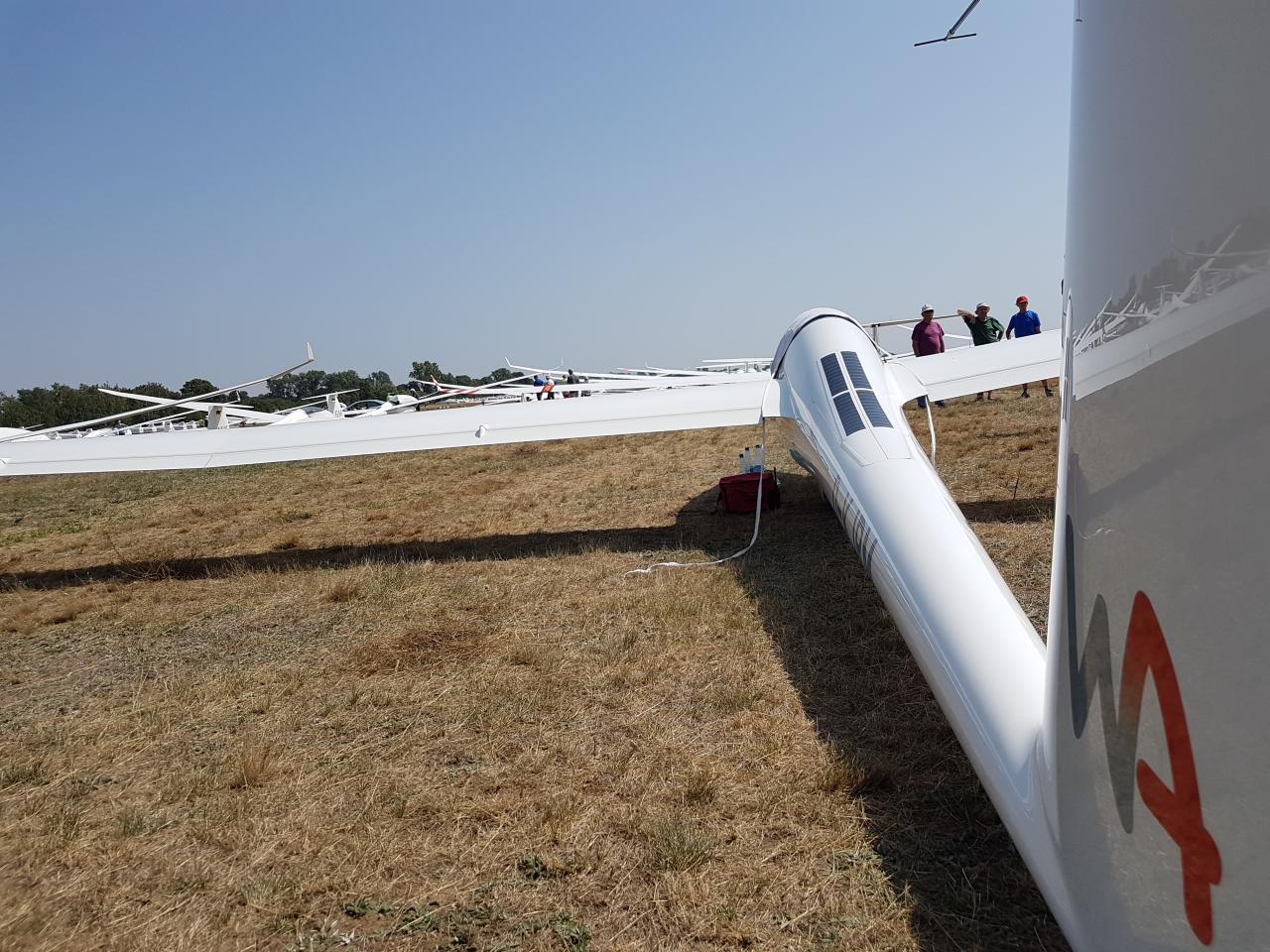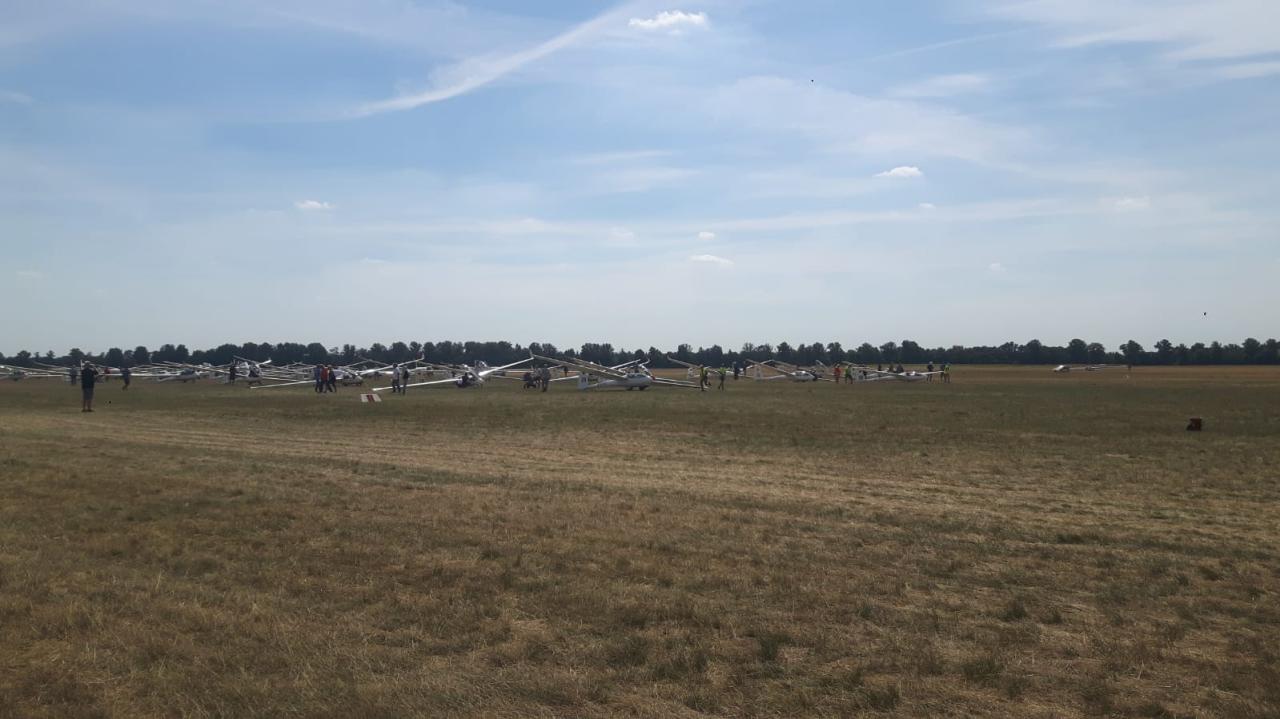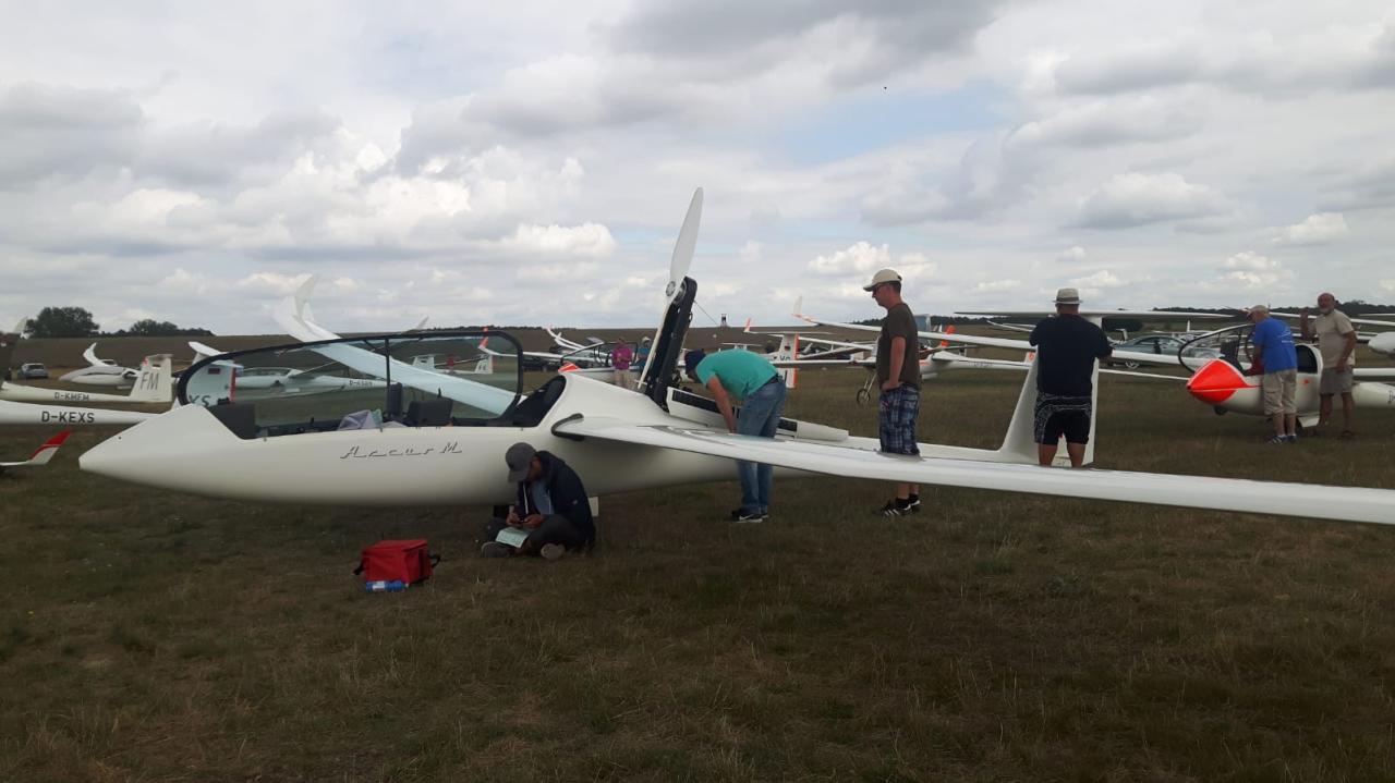 Alle haben die Sicherheit im Blick, die Heftigkeit des gestrigen Gewitters haben noch alle im Hinterkopf. Aktuell (13:00 Uhr) passiert hier allerdings nicht so viel, die Thermik geht noch nicht so richtig los. Bis jetzt ist zwar noch kein Clubklasse-Flugzeug wieder gelandet, so wie das aussieht könnte das aber gleich passieren. Mal sehen, ob es überhaupt zu einem Wertungsflug kommen wird.