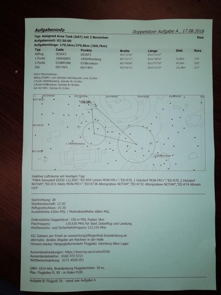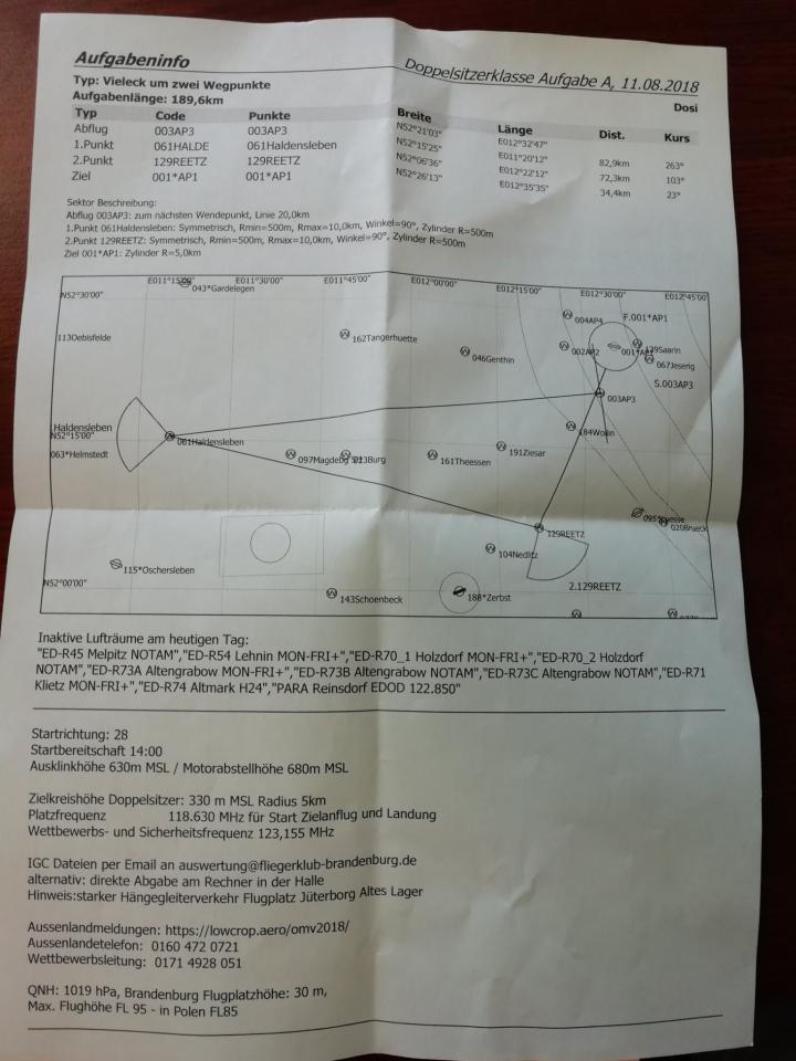 Der ausrichtende Segelflugverein liegt am Rande der Stadt Brandenburg an der Havel. Gestartet wird mit 29 Flugzeugen in der Clubklasse und 26 Flugzeugen in der Doppelsitzerklasse. Der Wettbewerb ist ein Qualifikationswettbewerb für die Deutschen Meisterschaften 2019. Geflogen wird vom 09. bis zum 17. August. Begleitet werden die Beiden von der – über die Landesgrenze hinweg bekannten – "Reisegruppe Sauerland" mit insgesamt 10 Erwachsenen und fünf Kindern.