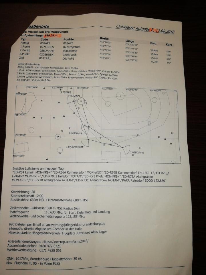 Heute ist der letzte Wertungstag - wenn es das Wetter zulässt. Startbereitschaft ist auf 12:30 Uhr festgelegt. Es gibt einen AAT mit 170,5 / 379,8 km mit einem Zeitfenster von 2:30 h. Als B-Aufgabe ist das Gleiche mit einem 30 Minuten kürzeren Zeitfenster vorgesehen.
