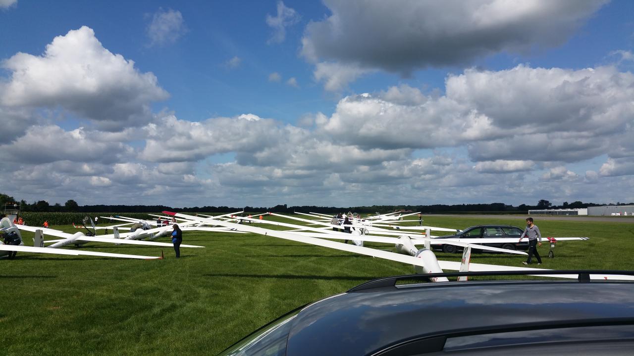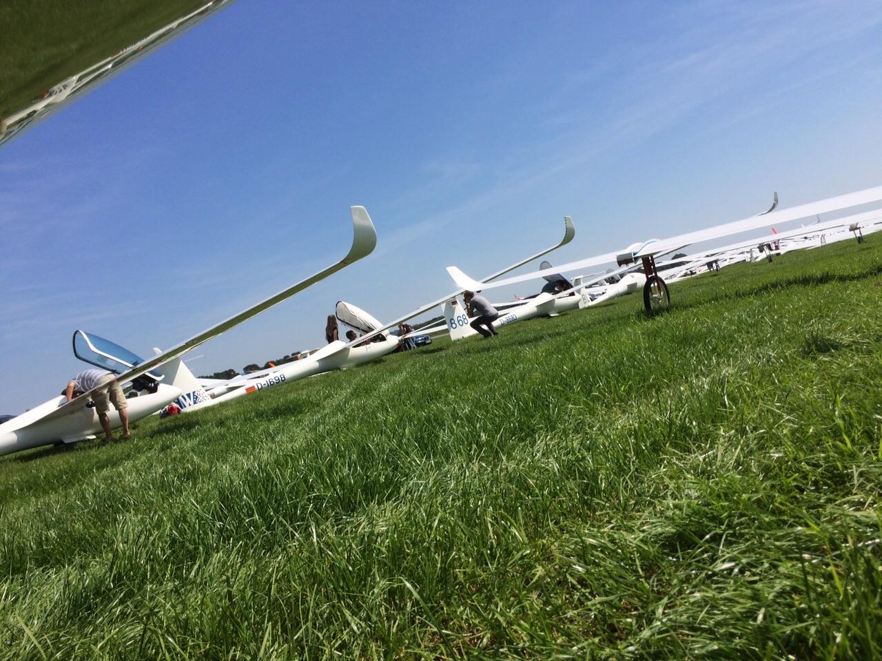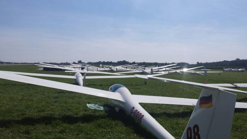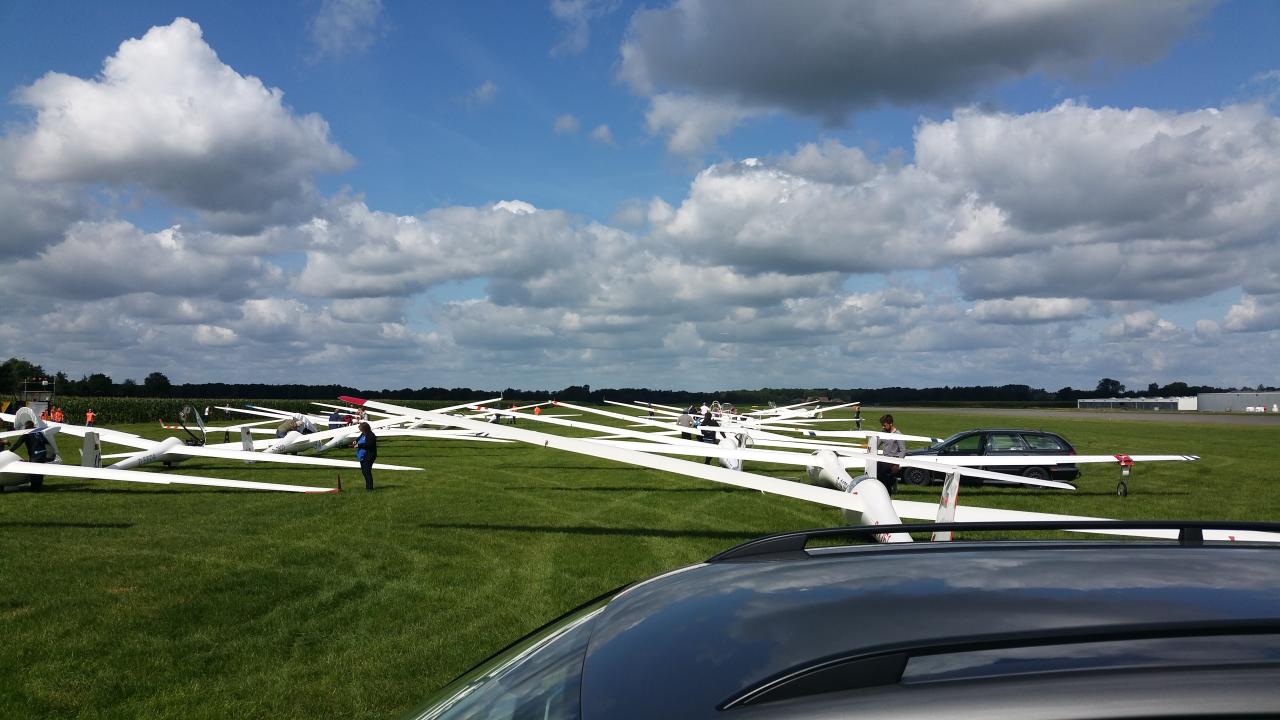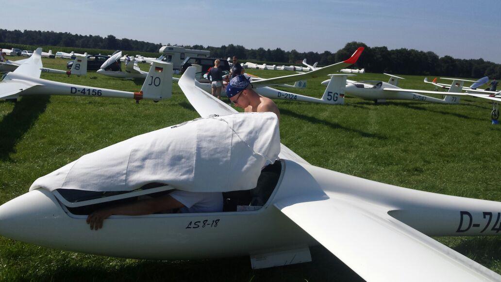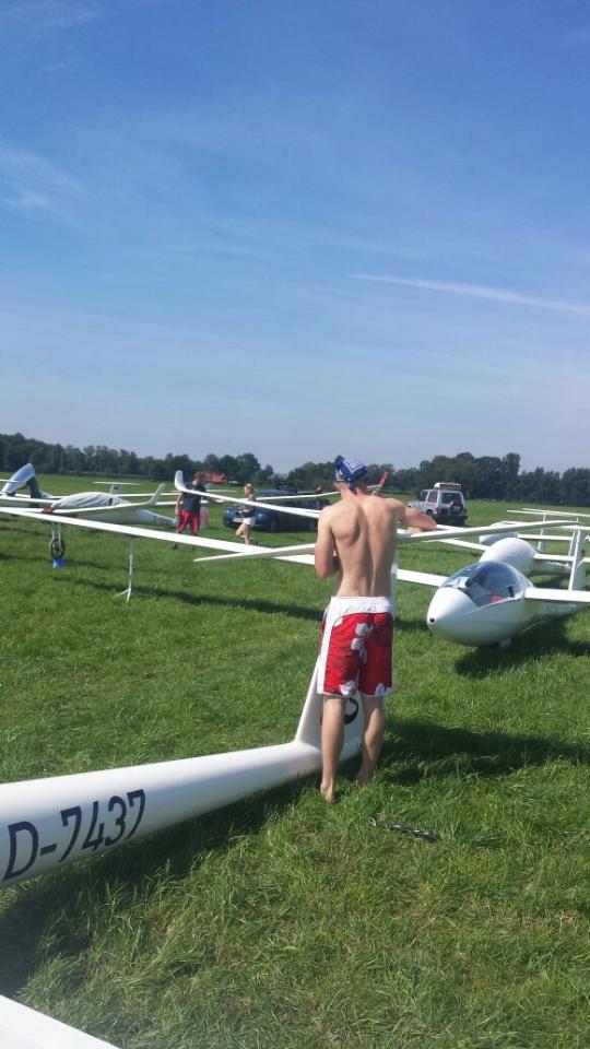 (Daniel Büenfeld). Für den heutigen Tag hatte sich Andre nochmal vorgenommen die LS8 gemütlich über dem Münsterland auszuführen und dabei ein paar Plätze gut zu machen. Leider hat sich das Wetter aber erst sehr spät am Tag entwickelt so dass die Wettbewerbsleitung die Standardklasse bereits um 12.00 Uhr neutralisiert hat. Wir haben den Tag dann genutzt um unser Lager bereits ein wenig aufzuräumen und bei Dodgeball Cup in Stadtlohn vorbei zu schauen. Ebenso haben wir uns um die Standbesetzung für das Flugplatzfest gekümmert - auch im Jahr 2015 dürfen wir Gustav Fröhlich mit seinem Sortiment zu unserm Fest begrüßen. Nun freuen wir uns auf die Abschlussfete wo wir uns nochmal von bester Oeventroper Seite präsentieren wollen. Morgen geht es dann wieder in die Heimat und wir freuen uns auf die nächten Flüge in Oeventrop.