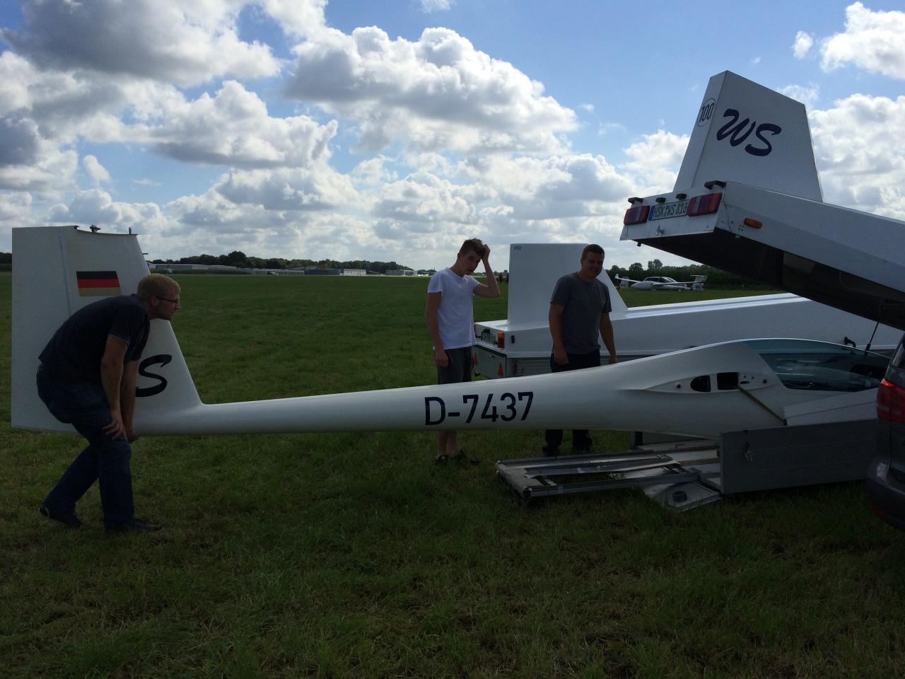 Update: Da ist's passiert! Um 18:25 landet Andre außen. Schade! Patrick, Leo und Sven machen sich jetzt auf ins 82 km entfernte Lingen im Emsland um unseren Piloten abzuholen. Hendrik bereitet derweil das Abendessen. Kleiner Trost: der Flugzeuganhänger der WS ist bei weitem nicht der Einzige, der heute eine unfreiwillige Ausfahrt machen muss.