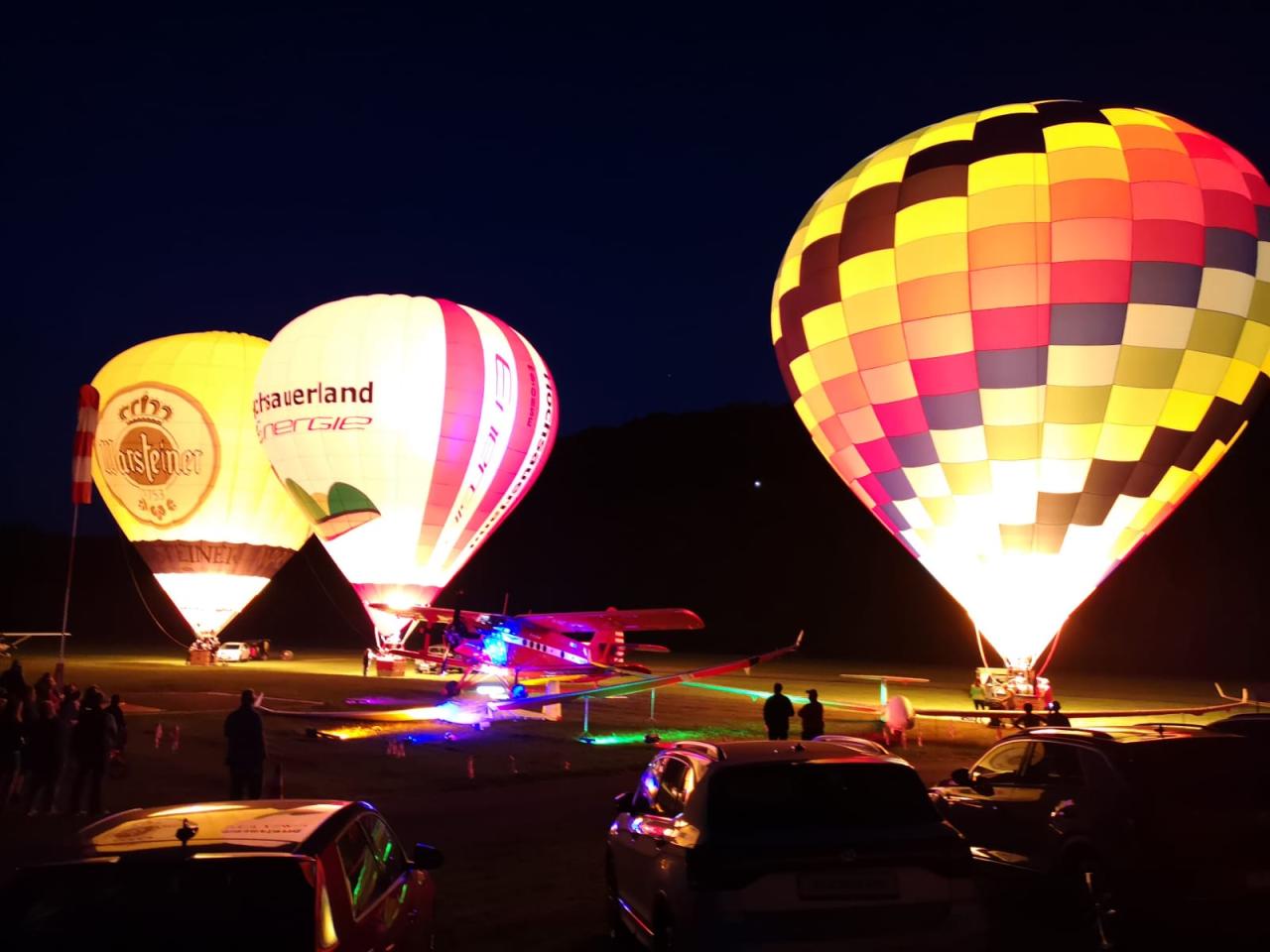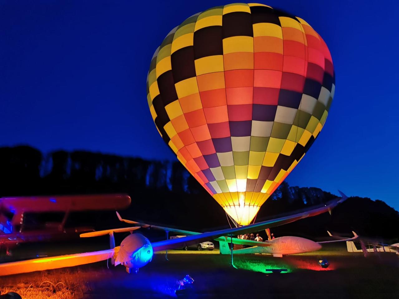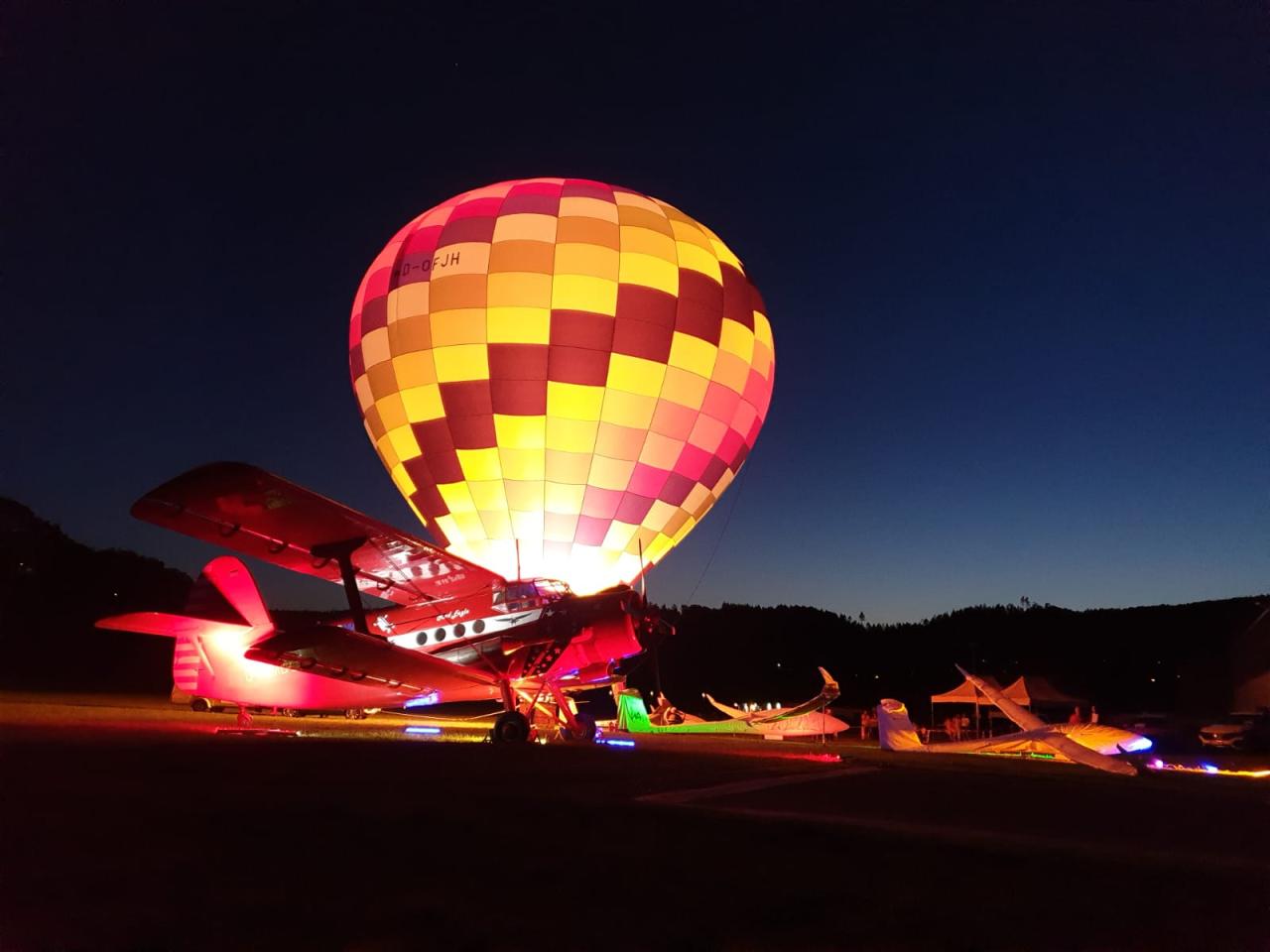 Ein Highlight war dieses Jahr sicherlich auch der Samstagabend. Drei Heißluftballone erleuchteten beim Nightglow die Ruhrwiesen vor der stimmungsvoll angestrahlten Antonov. Bei stimmungsvoller Musik ließen viele Besucher so den Abend gemütlich ausklingen.