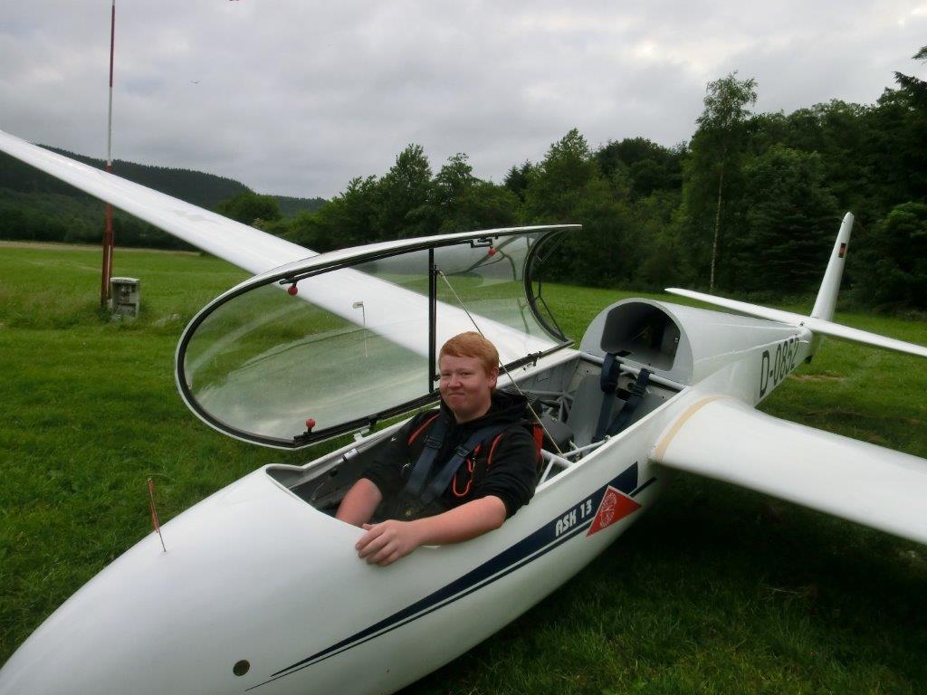 Nachdem die Polizei die Einbrecher festgenommen hatte und die Spuren gesichert waren, startete dennoch fast pünkltich zum Sonnenaufgang um 5:17 der erste Flieger. Um 7 Uhr war dann der große Moment für Frederik Linn gekommen. Nachdem sich auch der zweite Fluglehrer davon überzeugen konnte, dass Frederik die ASK 13 beherscht, flog dieser um 7 Uhr seine ersten drei Starts einsitzig und bestand damit seine A-Prüfung!