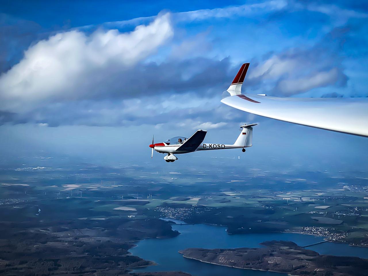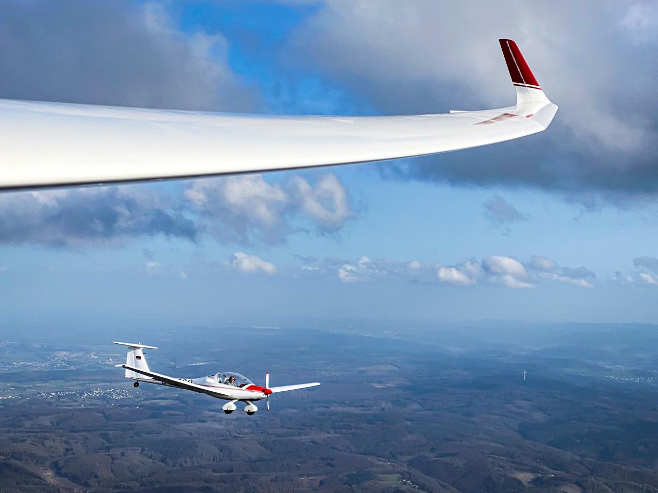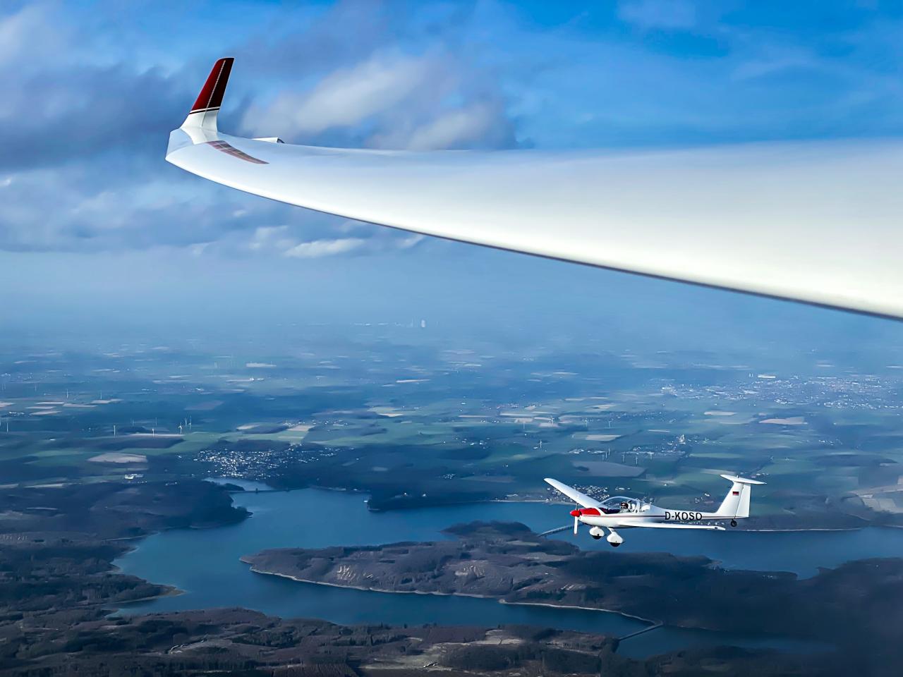 Mit dem vereinseigenen Motorsegler (Dimona) und einer privaten ASH26 im Eigenstart, flogen wir kurz nach der frohen Nachricht durch das Ordnungsamt und den Vorstand schon über Oeventrop. Die Sonne versorgte uns bereits jetzt, Mitte Februar, mit genug Energie für die ersten Aufwinde des Jahres. Direkt nach dem Start konnte sich André ein „Herrlich!!" Im Funkverkehr nicht verkneifen. Und er hatte recht! Ein Stück Freiheit unter den Flügeln, das kann man zur Zeit gut gebrauchen.
