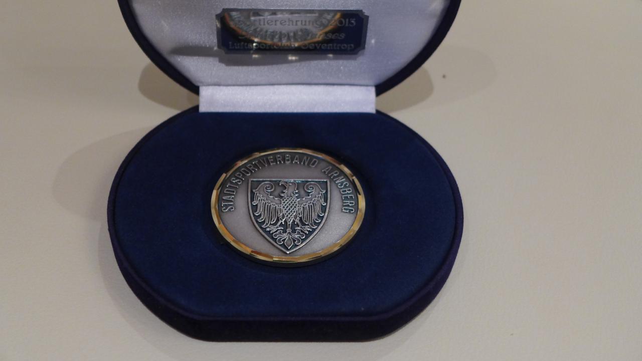 Marco Hanses und Sebastian Beule wurden in diesem Rahmen für die erfolgreiche Teilnahme an den Deutschen Meisterschaften im Streckensegelflug in der Doppelsitzerklasse ausgezeichnet. Mit einem hervorragenden 4. Platz hatten sich die beiden Piloten des LSC Oeventrop e. V. für die Segelflug-Nationalmannschaft qualifiziert und wurden nun für diese besondere Leistung mit der Silbermedaille der Stadt geehrt.