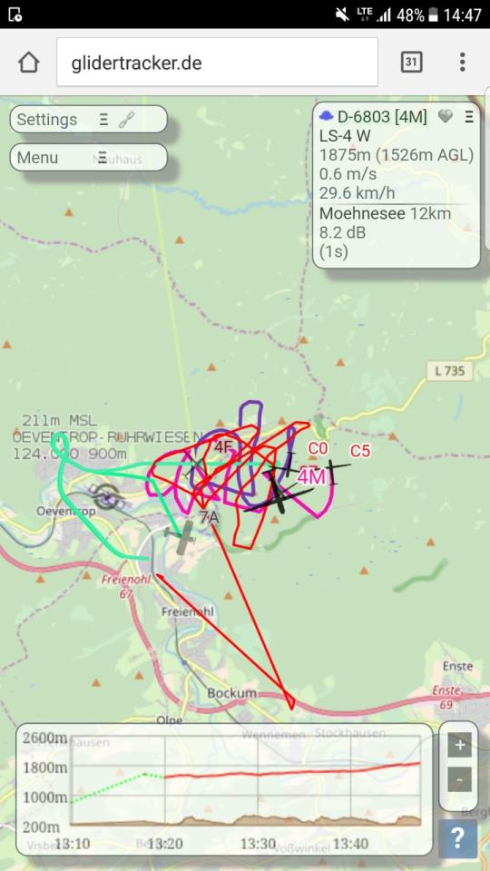 Später baute sich die Welle über ganz Oeventrop aus, so dass diese sogar aus der Winde direkt erreichbar war. So konnten bei guten Steigwerten Höhen von bis zu 2.500 m erreicht werden. Insgesamt waren vier Flugzeuge in der Luft, die in Summe über 100 km Streckenlfug im OLC dokumentierten. Auch unsere neue ASW 19 war mit dabei und hat den ersten längeren Flug gemacht.