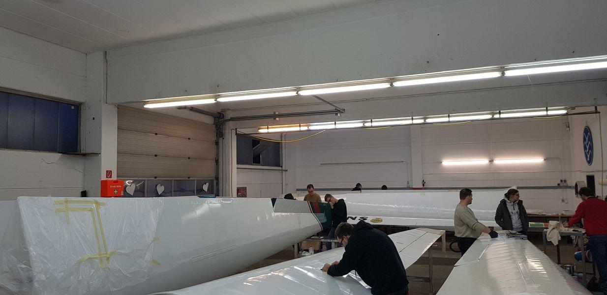 Die meiste Arbeit gibt es i. d. R. an den Holzflugzeugen zu erledigen. Dieses Jahr haben wir die Arbeit etwas anders organisiert als sonst: derzeit befinden sich die Flächen aller Holzflugzeuge in der Werkstatt. Sobald diese fertiggestellt sind, folgen alle Rümpfe der Holzflugzeuge. Wir erwarten mit dieser Organisation eine Zeiteinsparung bei den durchzuführenden Arbeiten.
