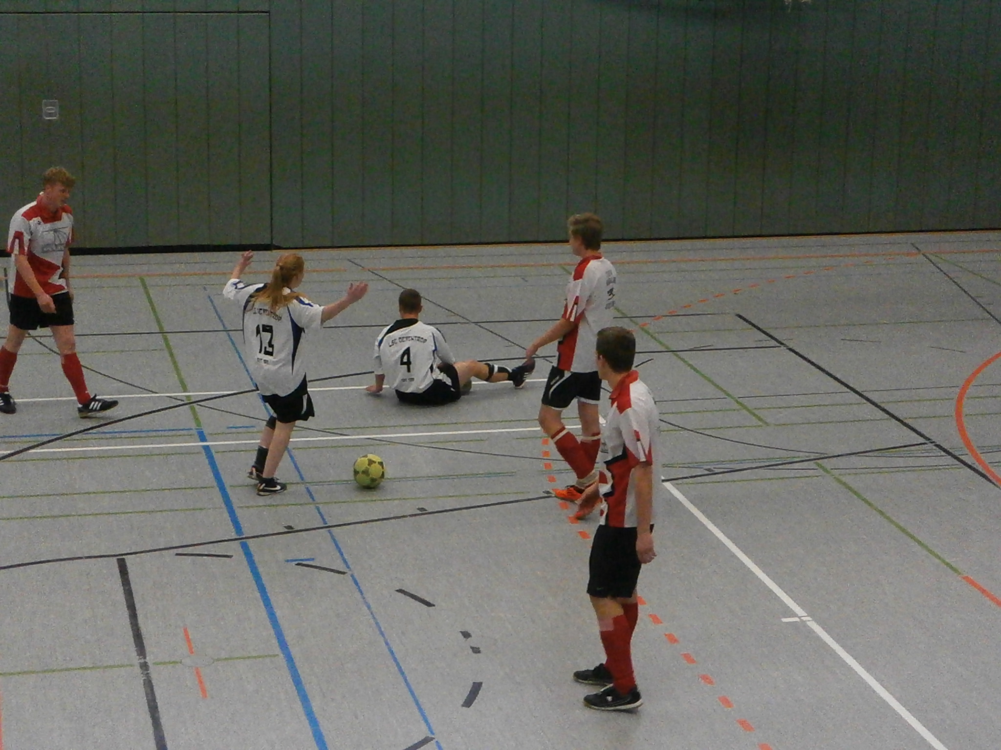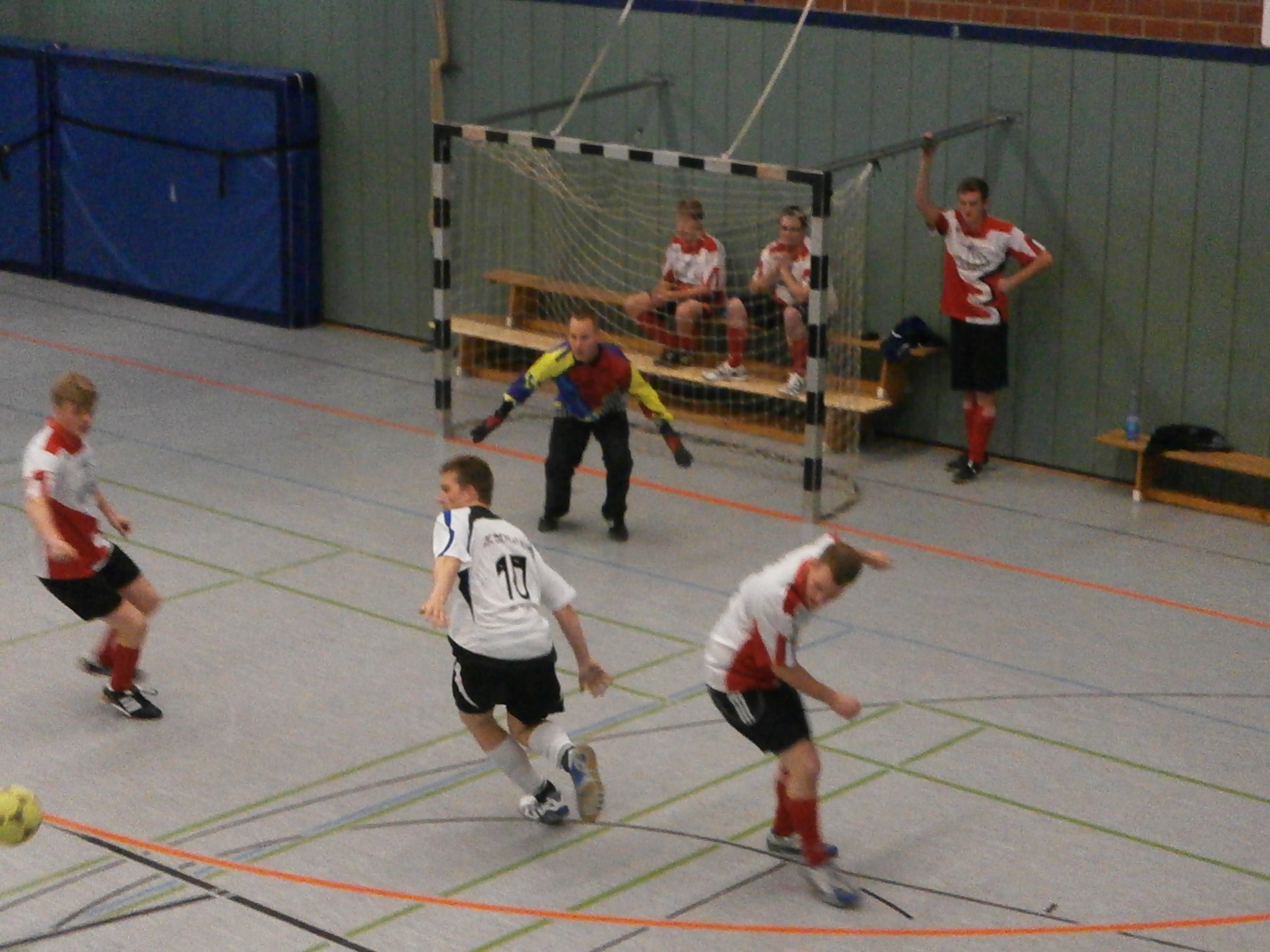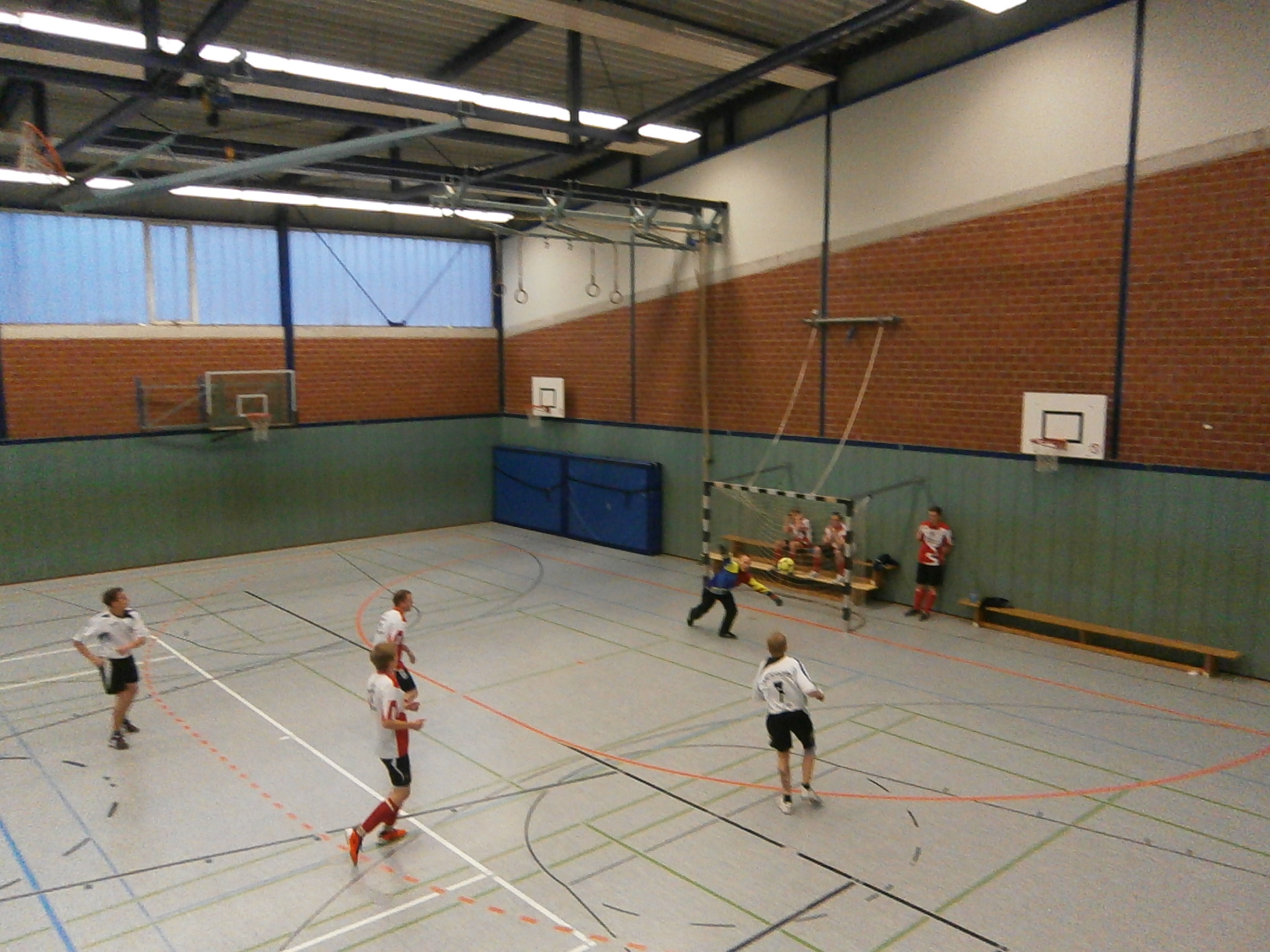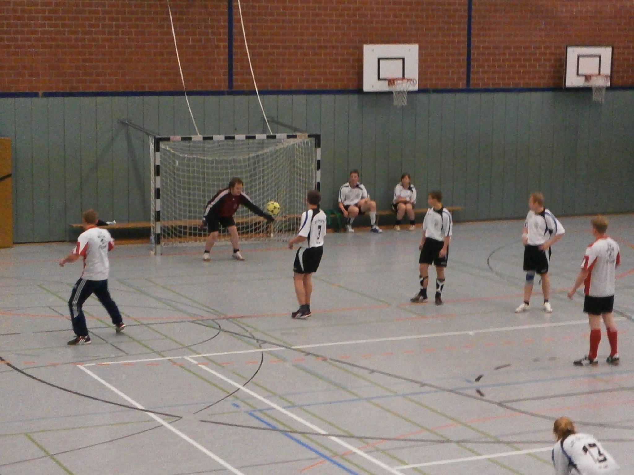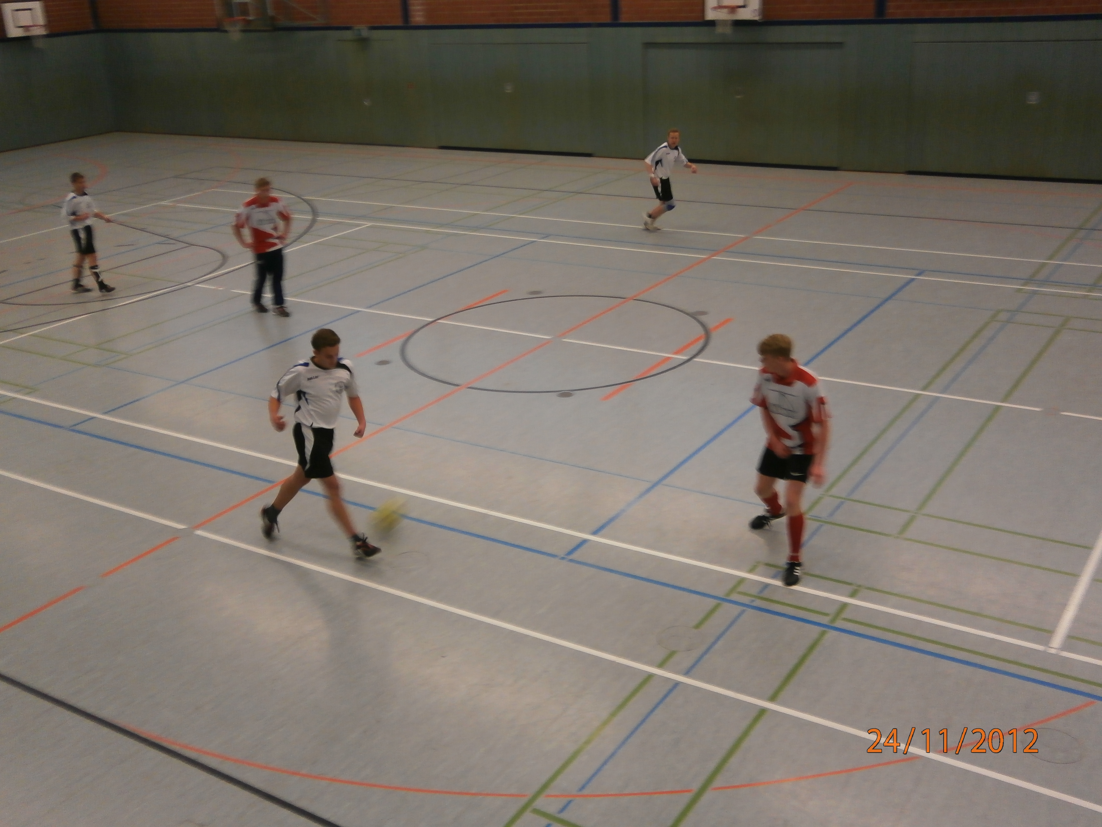 Bepackt mit Sportzeug, Trikots, Bannern, Gaströte und einer dicken Trommel ging es dann am Samstagmorgen um 0830 in Richtung Menden. Nach der Anmeldung und dem Einspielen hatte es der Turnierplan gut mit den Oeventropern gemeint und so durfte man gleich die beiden Eröffnungsspiele austragen. Schnell kristallisierte sich dabei heraus, dass es einen deutlichen Leistungsunterschied zwischen beiden Oeventroper Teams gab. Die zweite Mannschaft trat demnach eher unter dem olympischen Motto „Dabei Sein ist Alles" an, wohingegen sich die Erste schon Chancen ausrechnete, um die vorderen Plätze mitspielen zu können. Diese Ambitionen konnten in der Gruppenphase untermauert werden, welche die Erste Mannschaft souverän als Gruppenerster von 5 Mannschaften überstand und sich sicher für das Viertelfinale qualifizieren konnte.